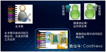通过使用EV2平台,发卡商和运营商可利用MIsmartApp衍生特殊令牌,发放给任何想要将自己的应用加载到卡内的第三方。运营商可以向第三方出售针对其他应用的内存空间,而无需共享该卡的主密钥。一个MIsmartApp令牌只允许卡内加载一个协议应用。